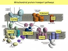 外膜にはTOM40複合体,TOB/SAM複合体,内膜にはTIM23複合体,TIM22複合体などのトランスロケータがあります。ほとんどのミトコンドリアタンパク質は,まず外膜のTOM40複合体によってミトコンドリア行きシグナルをチェックされ,βバレル型膜タンパク質Tom40がつくる膜透過チャネルを使って,ミトコンドリア内に取り込まれます。その後,目的区画別に各トランスロケータによる仕分けが行われます。たとえば外膜のβバレル型膜タンパク質は,膜間部にいったん移行した後, TOB/SAM複合体を使ってβバレル構造をつくりながら外膜に組み込まれます。ミトコンドリア行きシグナルをN末端の「プレ配列」にもつタイプのミトコンドリアタンパク質は,TIM23複合体を使ってマトリックスや内膜に仕分けられます。TIM23複合体はαヘリックスから成る膜透過チャネルをもち,このチャネルを通過するためには内膜の膜電位や,マトリックスのHsp70によるATP加水分解のエネルギーを必要とします。ADP/ATPキャリアやリン酸キャリアなど,プレ配列を持たない複数回膜貫通内膜タンパク質は,TIM22複合体を使って内膜に組み込まれます。このとき内膜の膜電位が必要となります。外膜にはTOM40複合体,TOB/SAM複合体,内膜にはTIM23複合体,TIM22複合体などのトランスロケータがあります。ほとんどのミトコンドリアタンパク質は,まず外膜のTOM40複合体によってミトコンドリア行きシグナルをチェックされ,βバレル型膜タンパク質Tom40がつくる膜透過チャネルを使って,ミトコンドリア内に取り込まれます。その後,目的区画別に各トランスロケータによる仕分けが行われます。たとえば外膜のβバレル型膜タンパク質は,膜間部にいったん移行した後, TOB/SAM複合体を使ってβバレル構造をつくりながら外膜に組み込まれます。ミトコンドリア行きシグナルをN末端の「プレ配列」にもつタイプのミトコンドリアタンパク質は,TIM23複合体を使ってマトリックスや内膜に仕分けられます。TIM23複合体はαヘリックスから成る膜透過チャネルをもち,このチャネルを通過するためには内膜の膜電位や,マトリックスのHsp70によるATP加水分解のエネルギーを必要とします。ADP/ATPキャリアやリン酸キャリアなど,プレ配列を持たない複数回膜貫通内膜タンパク質は,TIM22複合体を使って内膜に組み込まれます。このとき内膜の膜電位が必要となります。