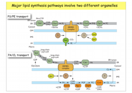 タンパク質の交通に比べて,まだほとんど分かっていないのが脂質の交通です。細胞内の各オルガネラ膜や細胞膜は各々脂質組成が異なっており,各生体膜の外側と内側でも組成が異なります。こうした各膜系固有の脂質組成は,オルガネラの機能発現に重要であると考えられています。細胞内でリン脂質合成を担う一連の酵素の多くは小胞体膜とミトコンドリア内膜に局在しています。したがって,細胞が必要とする脂質を合成するためには脂質が小胞体とミトコンドリアの間を往き来する必要があり,さらに合成された脂質は細胞内の様々な膜系に選択的に運ばれる必要があります。疎水的で水に溶けない脂質がどのように水溶性区画を越えて,膜から膜へと移動するのか,その方向性や特異性はどのように決まるのか,などの基本的な問題は,まだほとんど分かっていません。ミトコンドリアの外膜や内膜で外面と内面の間の脂質の反転輸送を担うスクランブラーゼやフリッパーゼについても,まったくわかっていません。