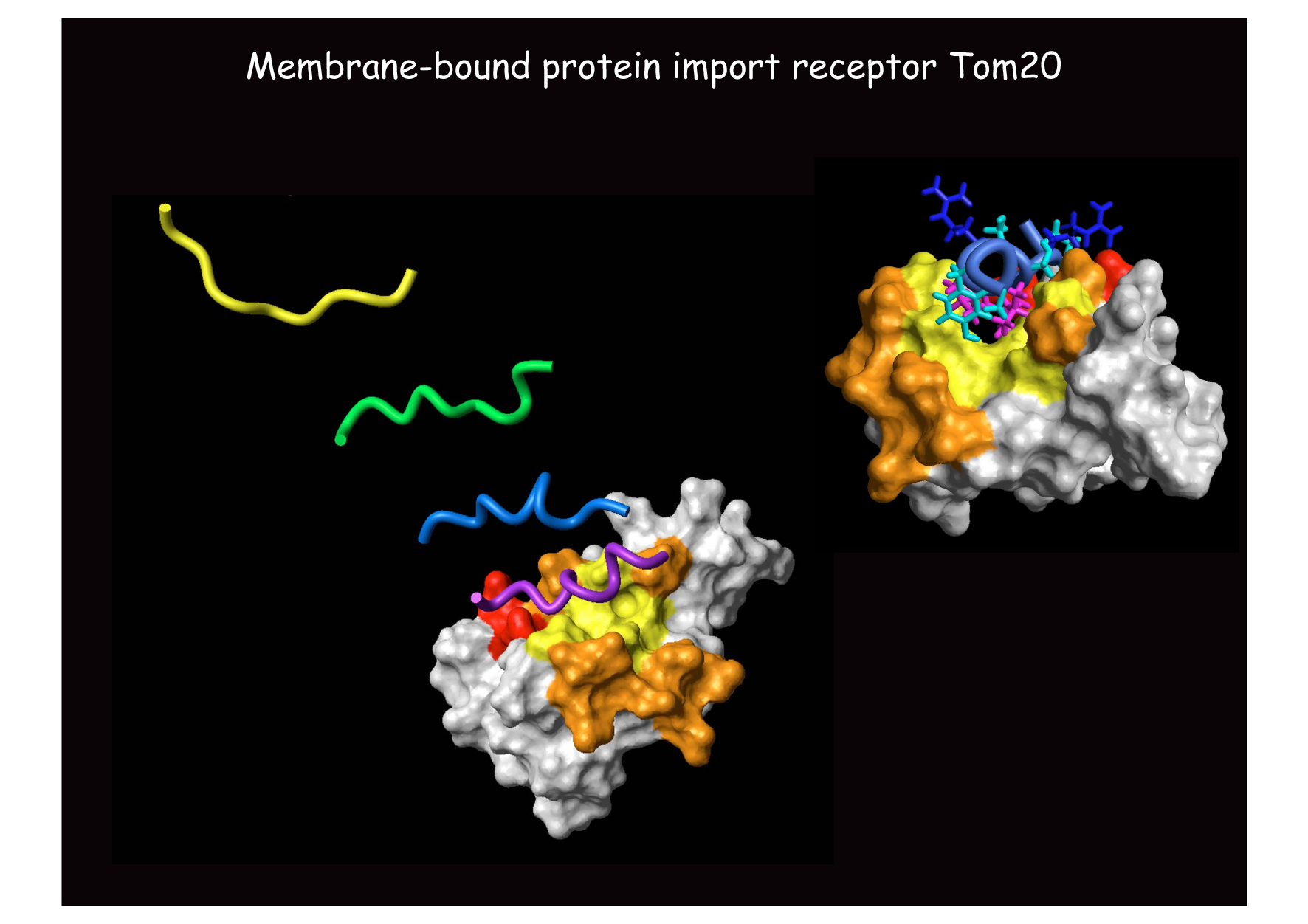 私たちは,2000年に神田大輔グループ(九大)との共同研究で,ミトコンドリア行きシグナル受容体Tom20の構造を決定しました。Tom20は膜結合型行き先シグナル受容体としては世界で最初の構造であったことから,多くの教科書にその構造が引用されています。その後も,膜間部でタンパク質にジスルフィド結合を導入するTim40/Mia40(細胞内でジスルフィド結合がかかるのは小胞体内腔とミトコンドリア膜間部だけです)やマトリックスのシャペロンHsp70のシャペロンTim15など,様々な因子の構造を決定しましたが,肝心のトランスロケータ複合体全体やその中心となる膜透過チャネルの精密構造はいまだに解明されていません。そのため,タンパク質の膜透過にともなうチャネルの開閉,膜透過の駆動力を与えるシャペロン等の因子との連携の仕組み,チャネルの膜方向(ラテラル)ゲートが開いて膜タンパク質が膜に組み込まれる仕組みなど,多くの問題が未解決のままです。明らかに構造生物学に基づく,トランスロケータの動作機構の解明が喫緊の課題と言えます。