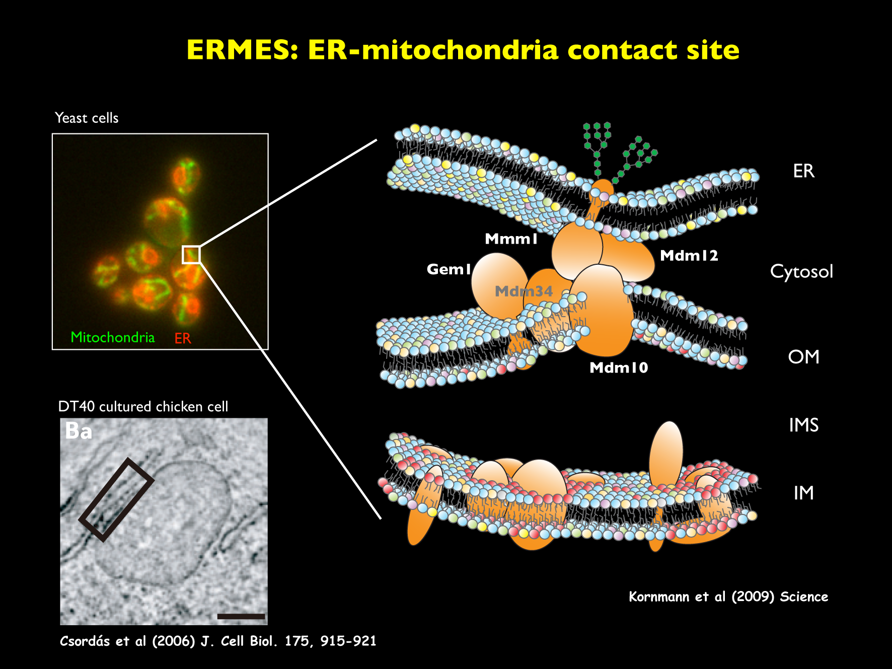 膜から膜へと脂質を運ぶ1つの方法は,専用の輸送タンパク質が1つの膜で脂質を積荷として積み込み,水溶性区画を拡散して,もう一つの膜で脂質の荷下ろしをすることです。実際,ミトコンドリアの外膜と内膜の間では,Upsタンパク質がホスファチジン酸などのリン脂質を特異的に運ぶことが分かってきました。一方,異なるオルガネラの膜間で脂質を移動させる拠点としての可能性が注目されているのがオルガネラ間テザリング(コンタクト)部位です。ER,ミトコンドリア,液胞,エンドソーム等の異なるオルガネラを物理的に接合させるテザリング部位が,いま次々に見つかりつつあります。なかでも出芽酵母のERとミトコンドリア外膜を接合させるERMESは,構成因子が同定され,その構造と機能が注目されています。脂質輸送だけでなく,ミトコンドリアの分裂や形態の制御部位としての機能,ERのカルシウムイオン貯蔵の制御など,様々な機能が考えられています。